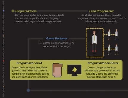 Programadores: Son los encargados de generar la base donde transcurre el juego. Escriben el código que determina las reglas de todo lo que sucede.