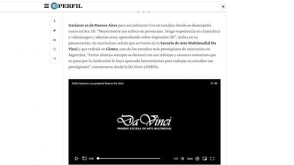 La nota de Perfil también resalta la trayectoria de Gariazzo, desde su formación en Da Vinci hasta su trabajo en Gizmo, uno de los estudios de animación líderes de la Argentina. Allí, la artista desarrolló el modelo 3D del Lionel Messiniño de la famosa publicidad Heart of a Lio lanzada por Gatorade, que sobrepasó las ocho milllones de visualizaciones.