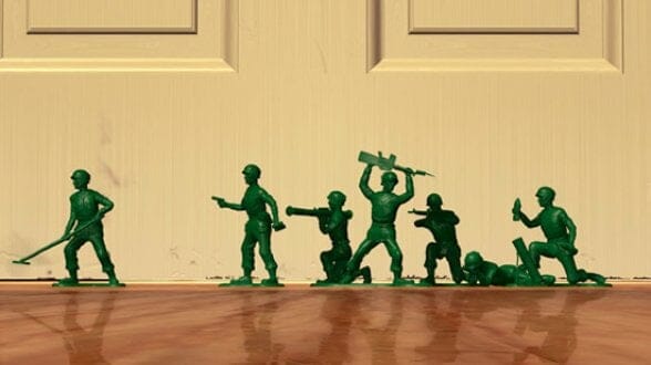 Y en relación a la experimentación, la compañía Hasbro temió que sus juguetes de G.I. Joe fueran maltratados, por lo que se negó a que aparecieran. Se los reemplazó con los conocidos soldaditos verdes que llevan a cabo sus misiones a base de un gran profesionalismo táctico-estratégico. Un caso parecido fue el de Mattel, que no quiso figurar por pensar que la obra sería un fracaso. Tras el éxito, aportaron su Barbie en Toy Story 2.