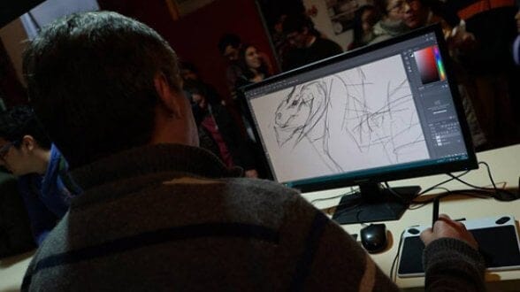 La cola que se formó afuera de la Escuela causó que la conferencia inaugural, a cargo del docente y paleoartista internacional Jorge Blanco, se retrasara unos minutos. Profe del Curso de Formación Profesional de Ilustración Artística/Digital: Anatomía avanzada y Morfología animal, Blanco se centró en los dragones: a lo largo de su presentación, dibujó varios de ellos con el pincel de Photoshop.