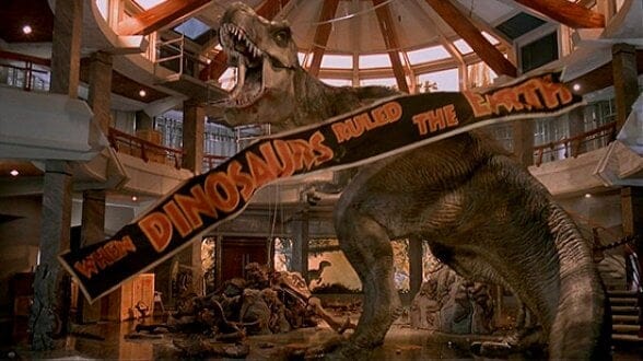 4 - Jurassic park. Esta película habría sido realizada con efectos de stop motion y animatronics de no ser por un par de artistas digitales que se arriesgaron -dedicando tiempo extra- a la creación de pruebas de animación digital y render fotorrealista, y así lograron convencer al director de dejar atrás el stop motion. ¿Se imaginan cómo se hubiera visto Jurassic Park con esa técnica? Sin duda, el que no haya sido así fue otro antes y después para la industria de los VFX (y para 3D en el cine). La escena final con el tiranosaurio fue la primera vez que apareció un render tan grande y con iluminación de día en una pantalla de cine. Obtuvo un realismo indistinguible.