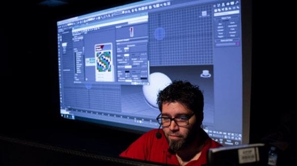 Viegas, coordinador del Curso de Formación Profesional Modelado 3D y Render, comenzó la jornada con la muestra en pantalla de su creación, una cálida sala de estar con la luz solar entrando por las amplias ventanas. "¿Qué partes son propias del proyecto y cuáles no?", preguntó al público del auditorio. Enseguida, explicó que era importante saber qué se podía lograr con el programa 3ds Max y el motor V-Ray o SolidRocks, y qué había que dejar de lado para tratarlo en la etapa de posproducción.